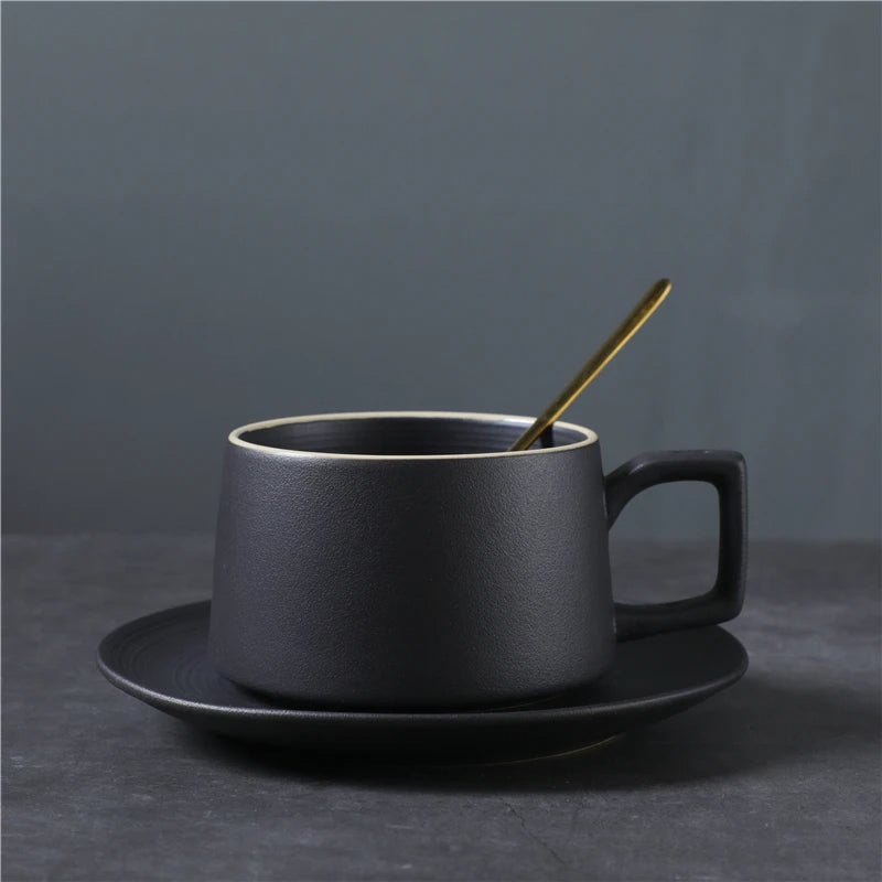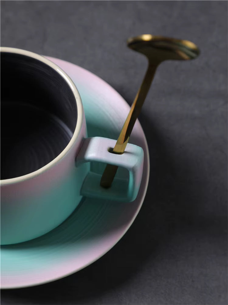 Jego matowa powierzchnia przyjemnie leży w dłoni, a geometryczne, kanciaste ucho nadaje formie charakteru i wyrazistości. Wnętrze pokryte jest gładką czernią, która pięknie kontrastuje z zewnętrznym, rozmytym kolorem. Do kompletu: idealnie dopasowany spodek i elegancka, złota łyżeczka.