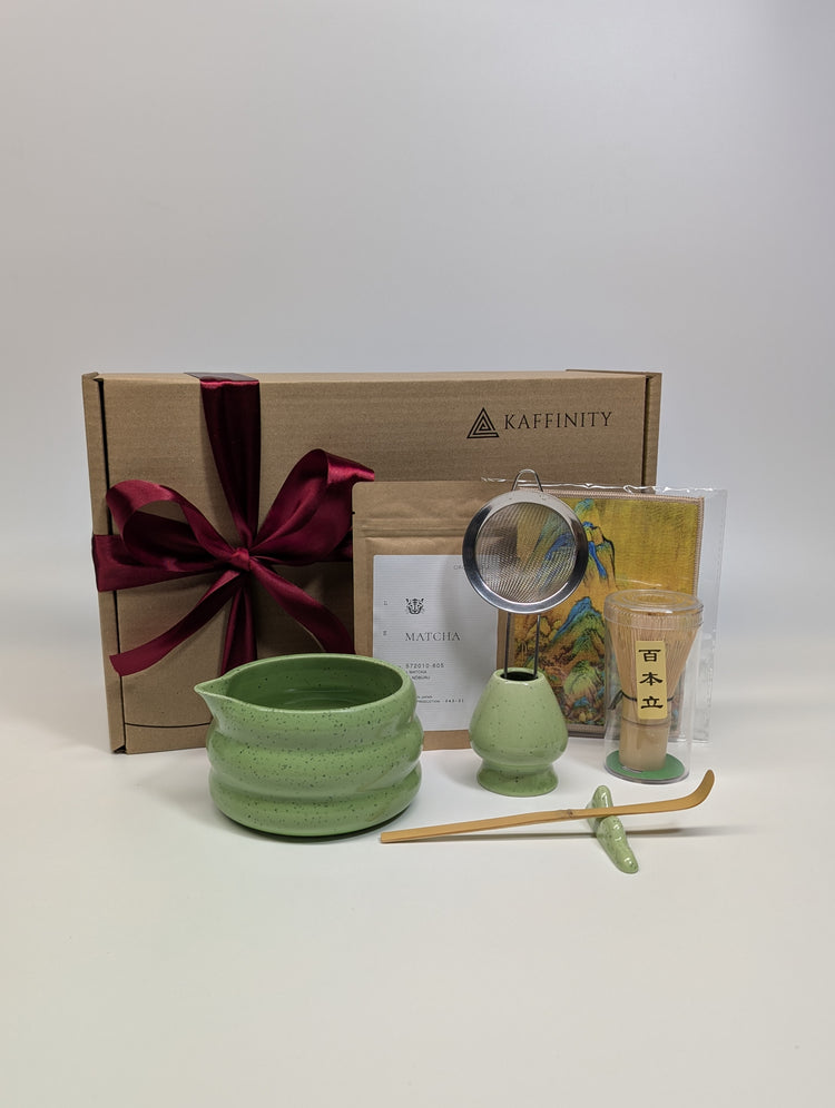 To praktyczny prezent, który po otwarciu jest gotowy do użycia — wszystko, co potrzebne do przygotowania matchy, znajduje się w środku.